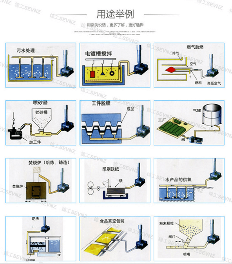 在紡織、冶金、城市煤氣、交通、糧油加工、造紙、醫藥等部門也被廣泛應用,在一些特殊的場合,還需要進行特殊的保護:比如說在密封環境中使用時,要注意通風散熱;高壓風機采用寬頻,寬壓電機,單相110V/230V 工業三相:220/380/415/660V等,當環境溫度(進氣溫度比較高時),更要注意通風散熱,或者選擇允許進風溫度較高的高壓風機,機械磨損非常微小,使用壽命長,體積小型,易于安裝與使用在各類機械設備上,